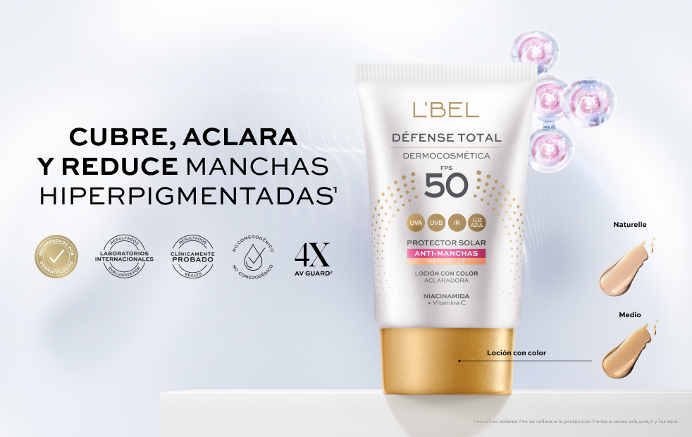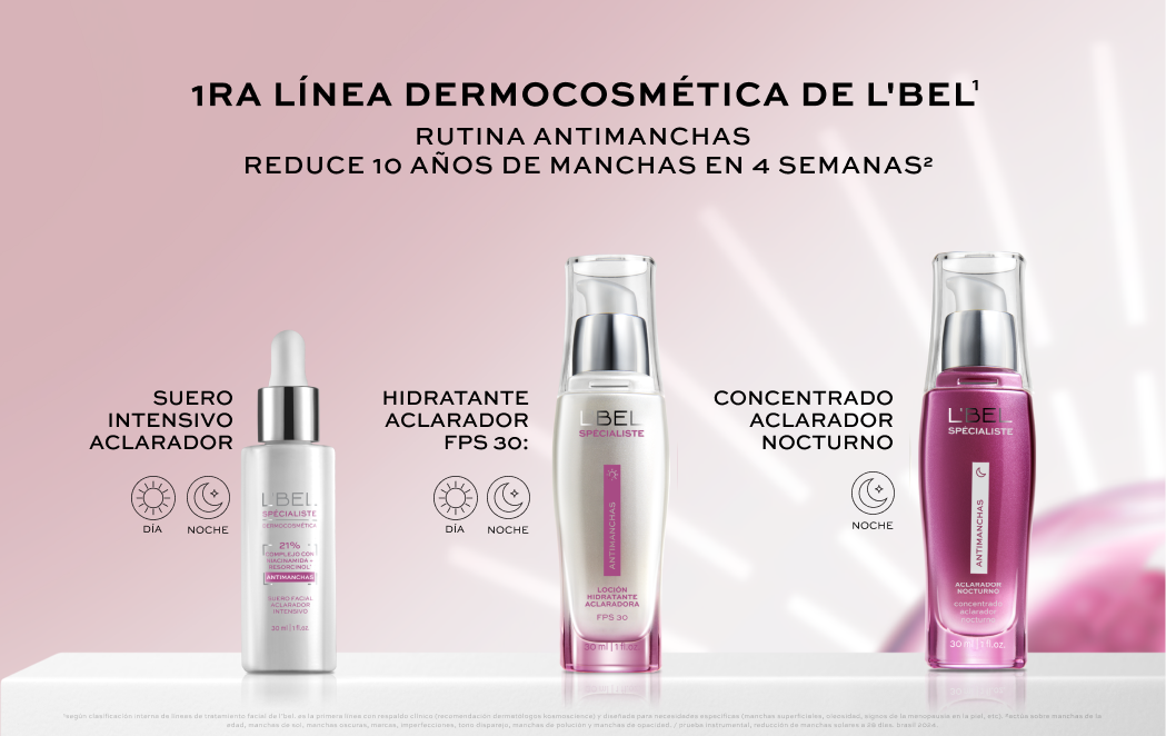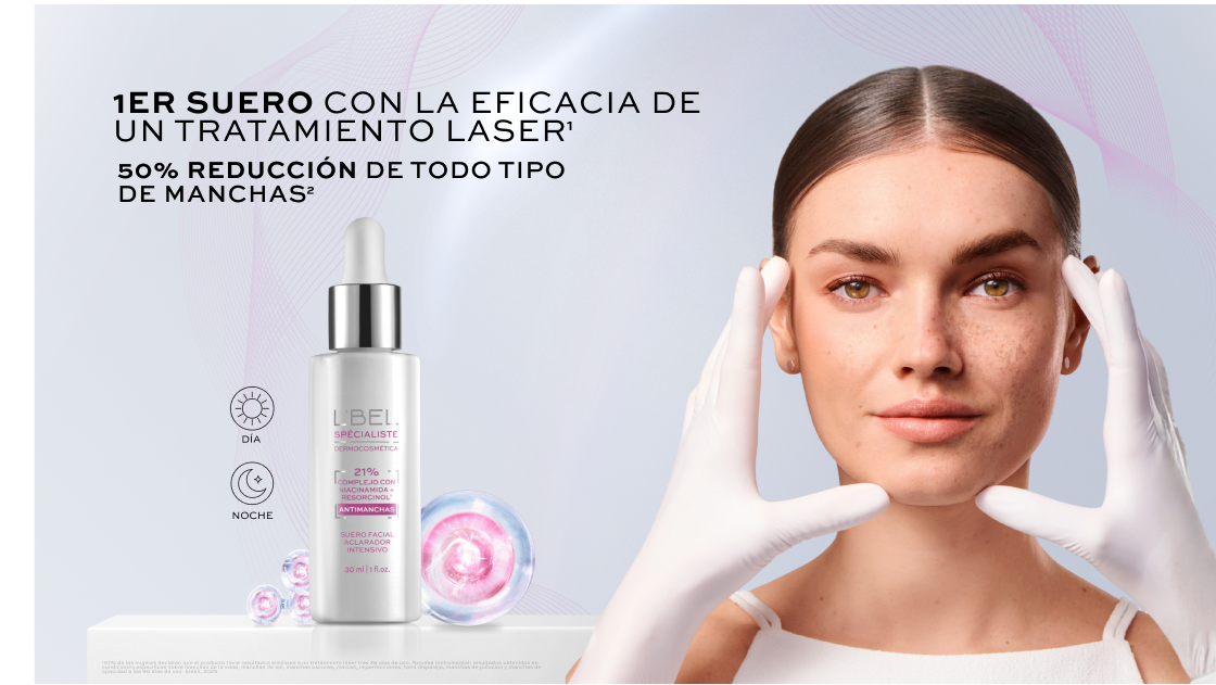 ²Actúa sobre manchas de la edad, manchas de sol, manchas oscuras, marcas, imperfecciones, tono disparejo, manchas de polución y manchas de opacidad. / Prueba instrumental, reducción de manchas solares a 28 días. Brasil 2024. ³Según clasificación interna de líneas de Tratamiento Facial de L’Bel. Es la primera línea con respaldo clínico (recomendación dermatólogos Kosmoscience) y diseñada para necesidades específicas (manchas superficiales, oleosidad, signos de la menopausia en la piel, etc).